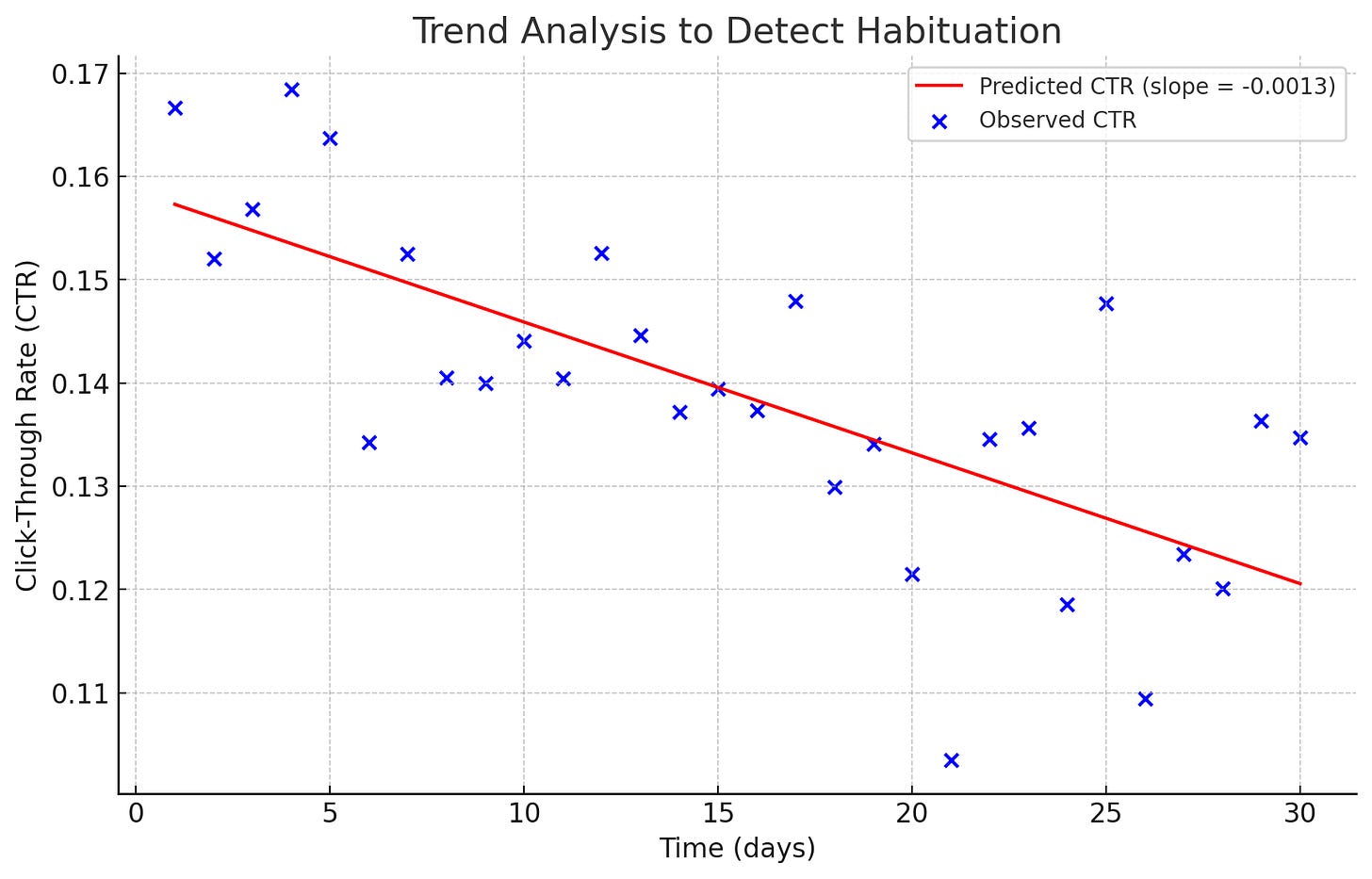 Click-Through Rate (CTR): A declining CTR over time can be a strong indicator of habituation.